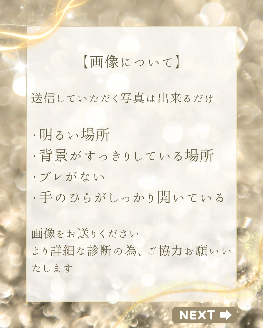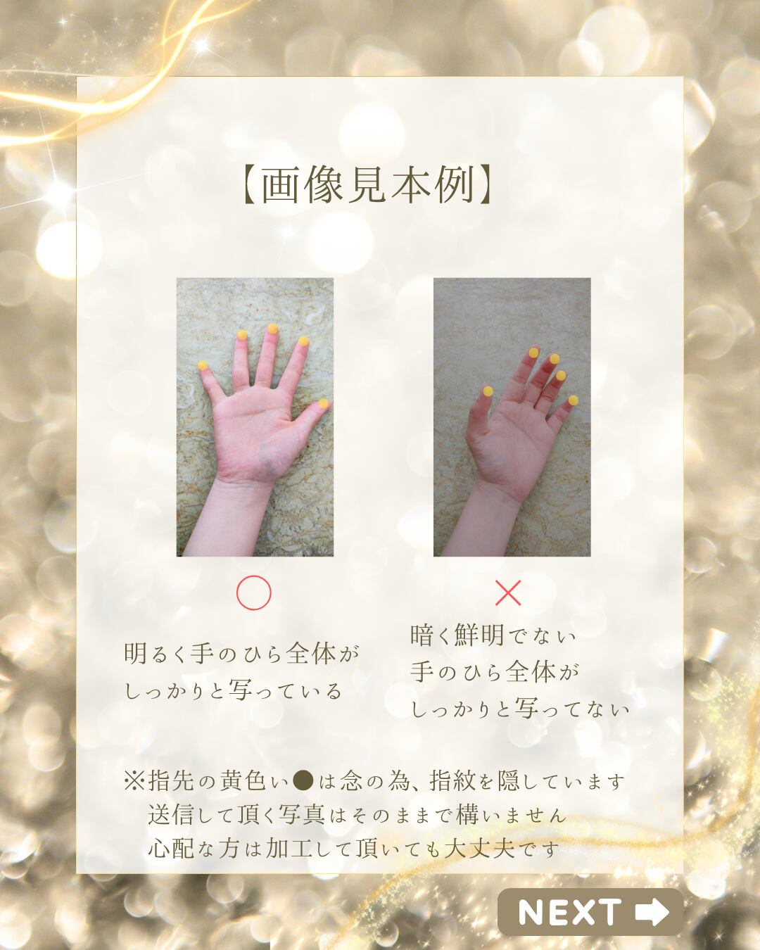 ①購入後、チャット機能より手のひらの画像左右 各1枚、合計2枚を送信してください