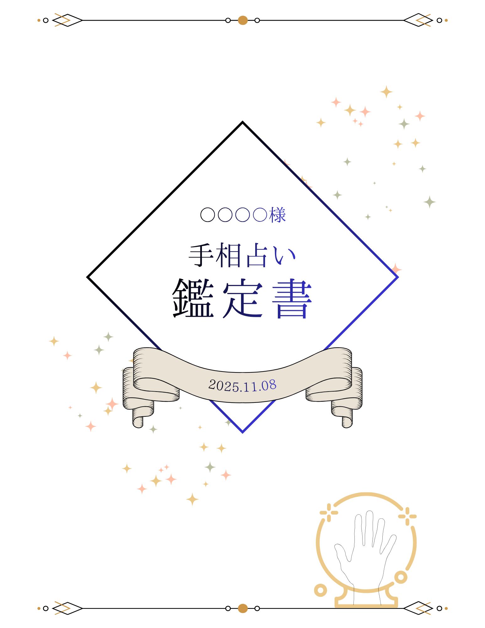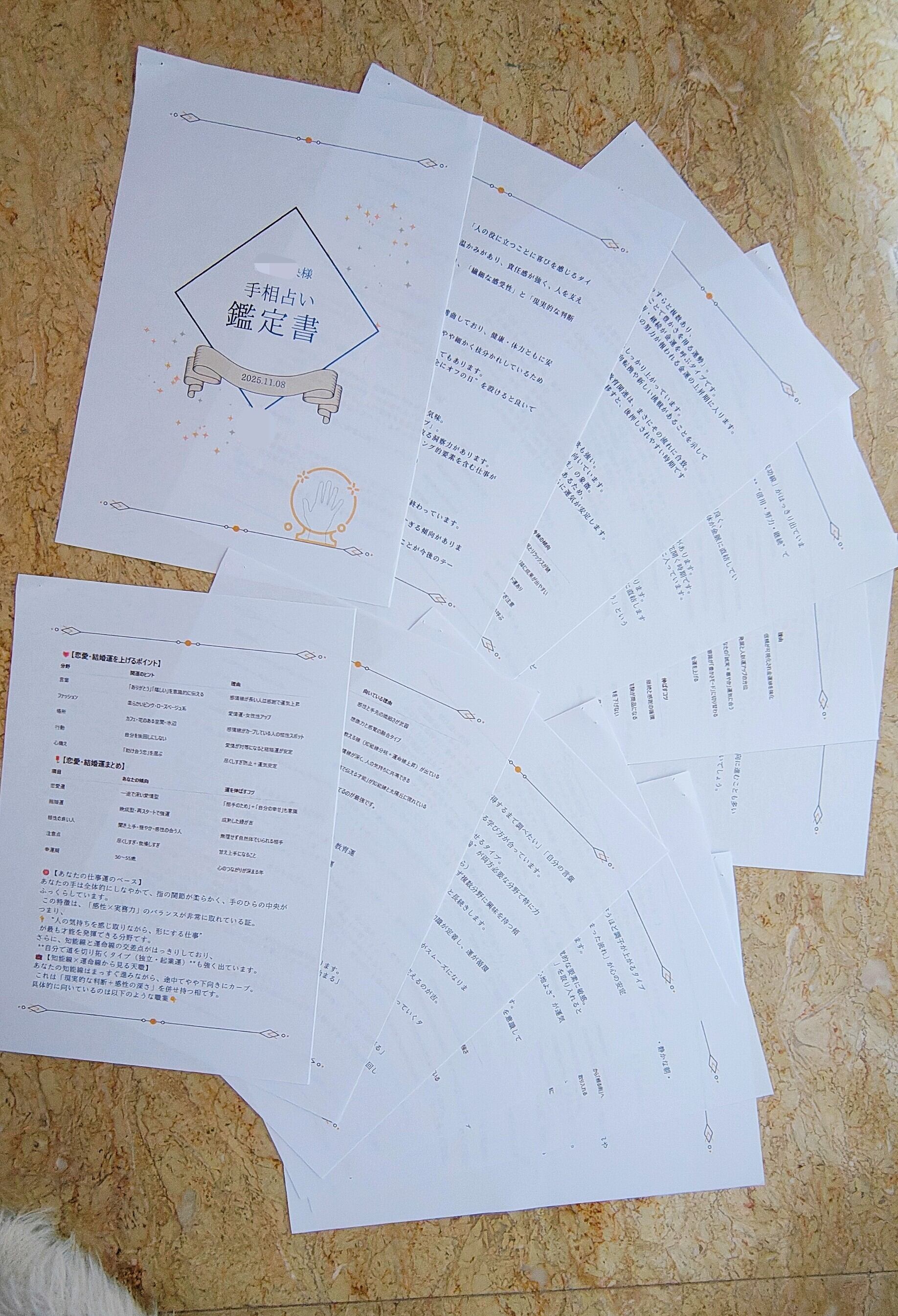 この鑑定書は、わかりやすい言葉で丁寧にまとめられているため、手相の知識がない方でもスムーズに理解できます。自分を見つめ直すきっかけとして、または大切な方へのギフトとしても最適です。